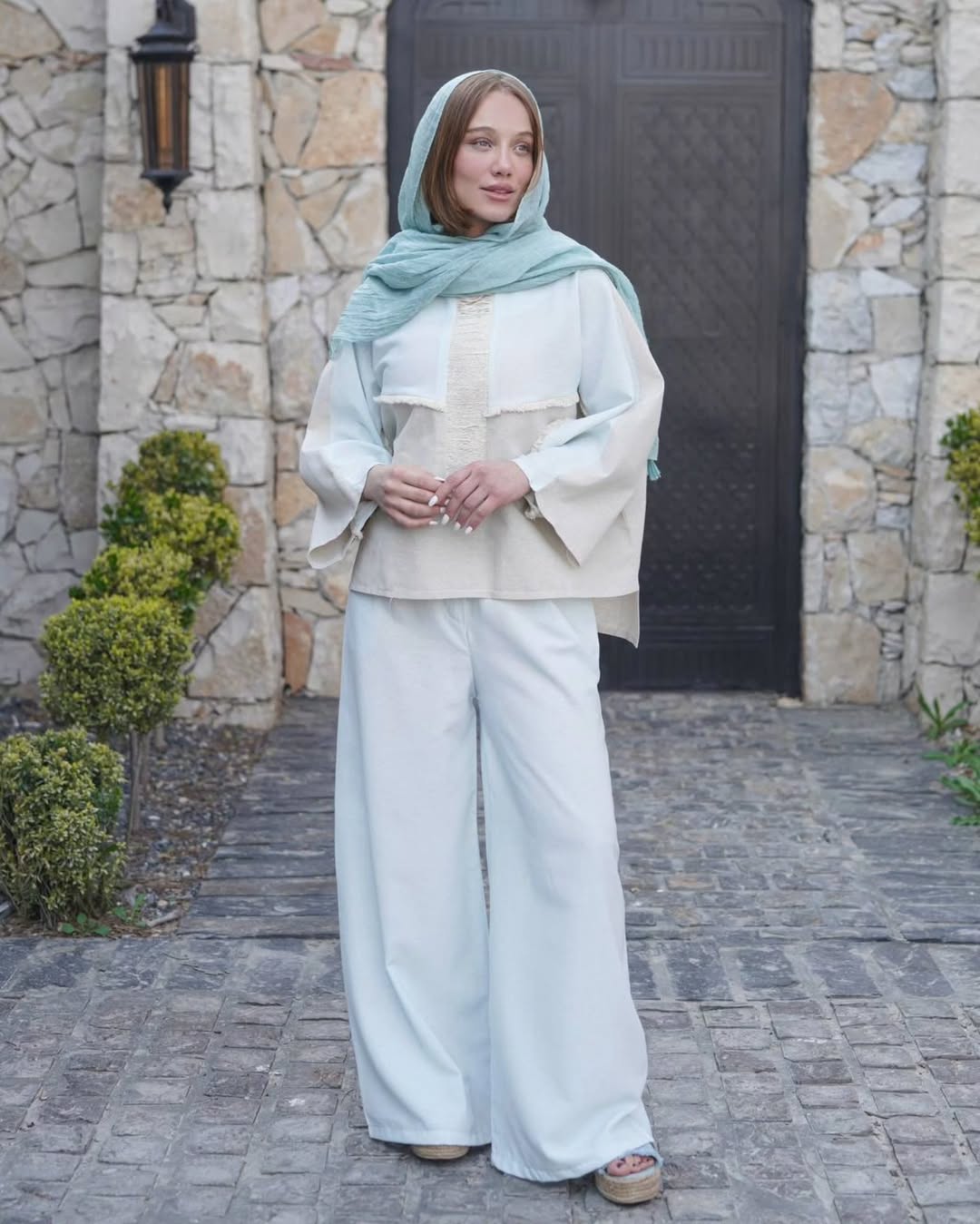ست بلوز شلوار لینن در دو سايز مناسب سایز ۳۸ تا ۴۴ بسیار شیک و راحت و خنک ترکیب جذاب آبی آسمانی و کرم که در کنار هم خیلی خاص شده
