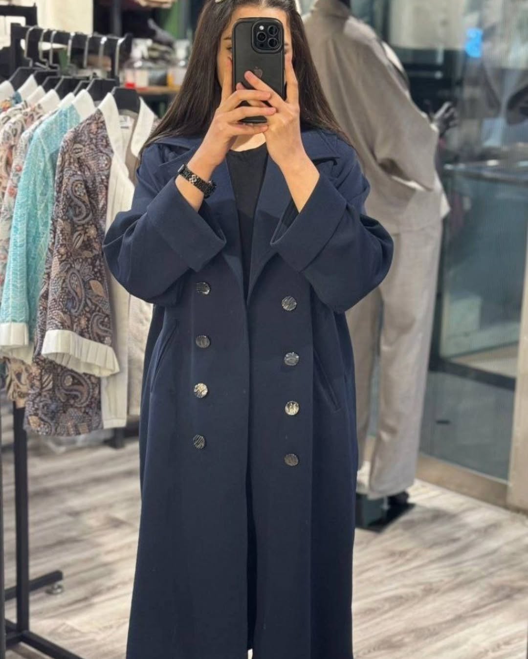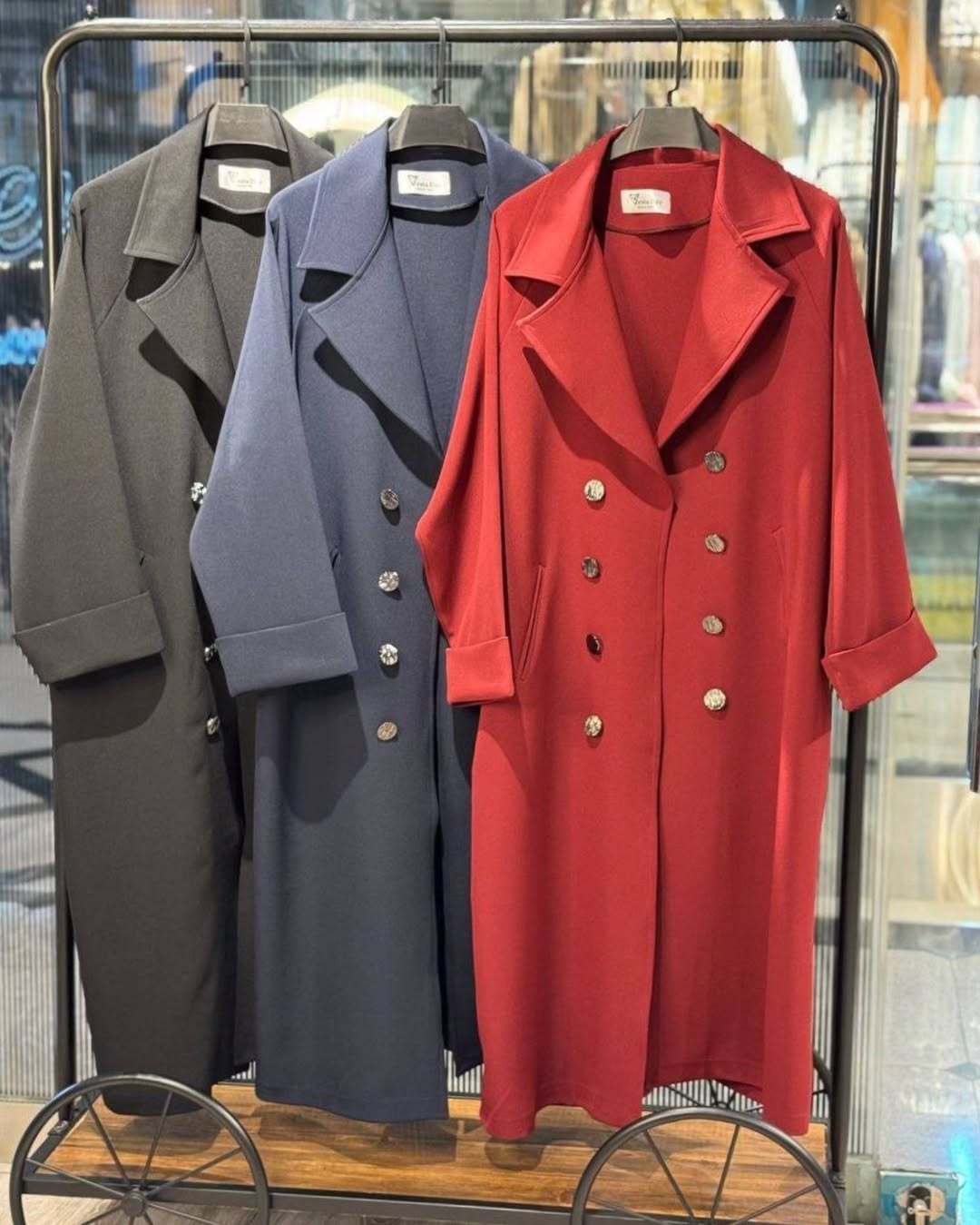 مانتو بلند پریماه جنس کار : مازراتی رنگبندی : ۳ سایز : فری قد کار ۱۱۵ مناسب استایل روزانه و رسمی ۶ دکمه جلو باز