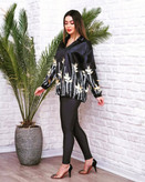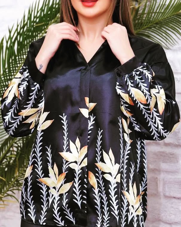 شومیز ساتن طرح گندمی سفید و مشکی زنانه فری سایز مناسب تا سایز ۴۲